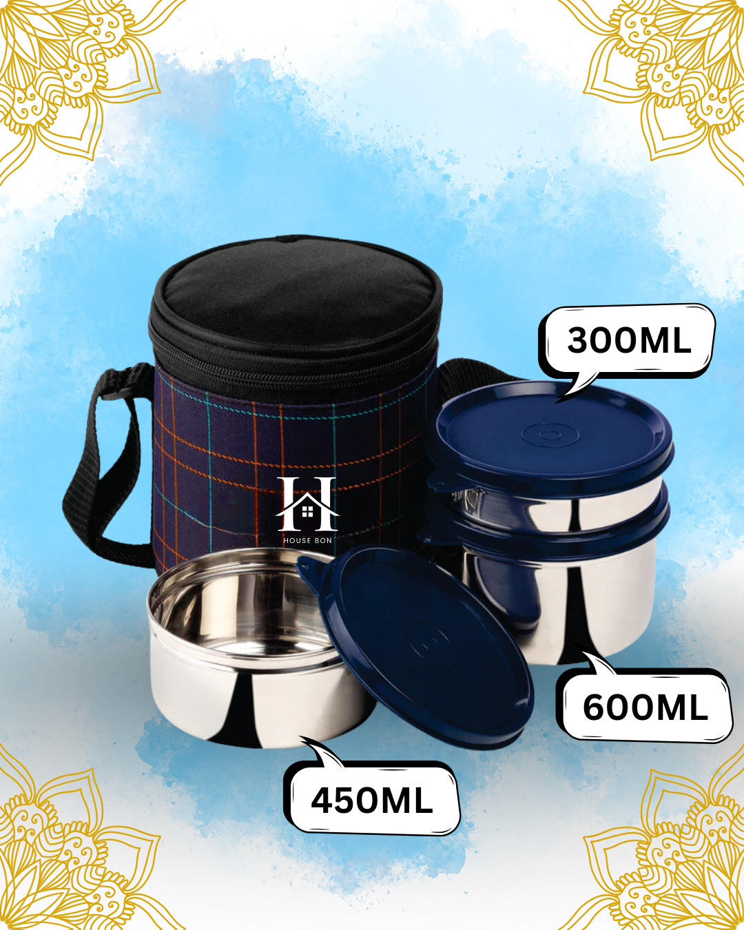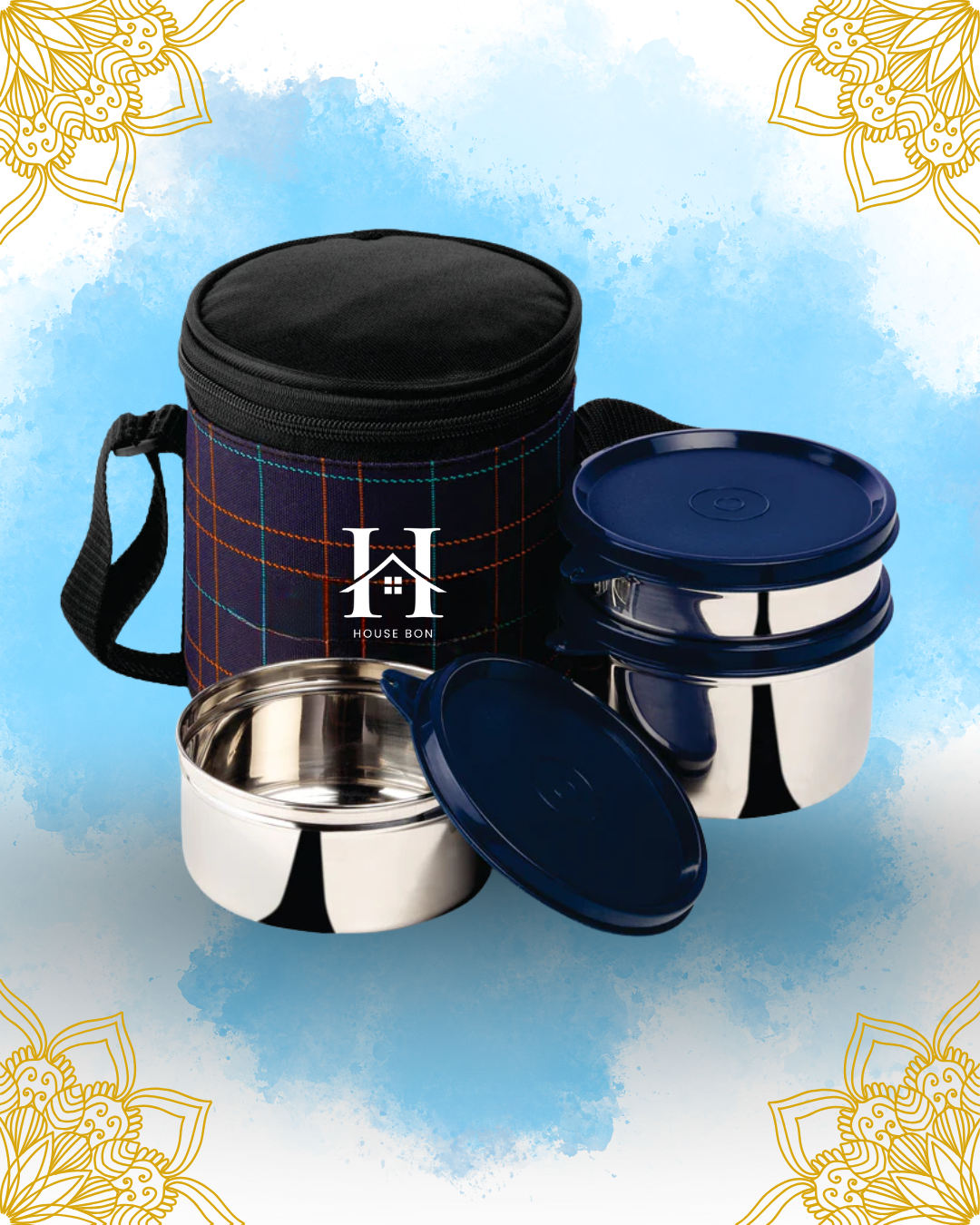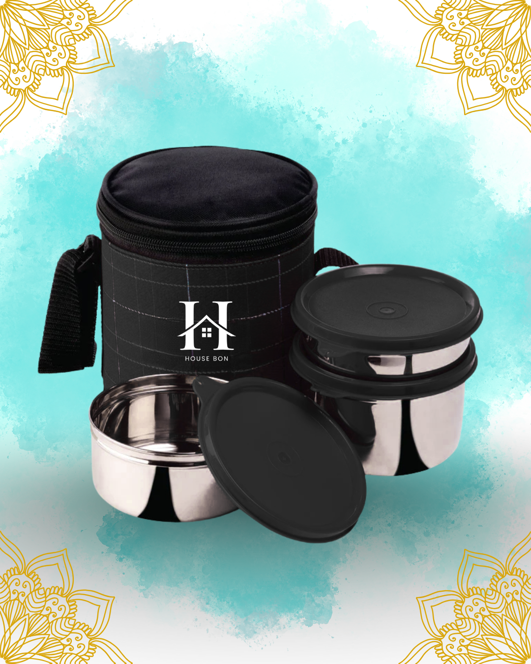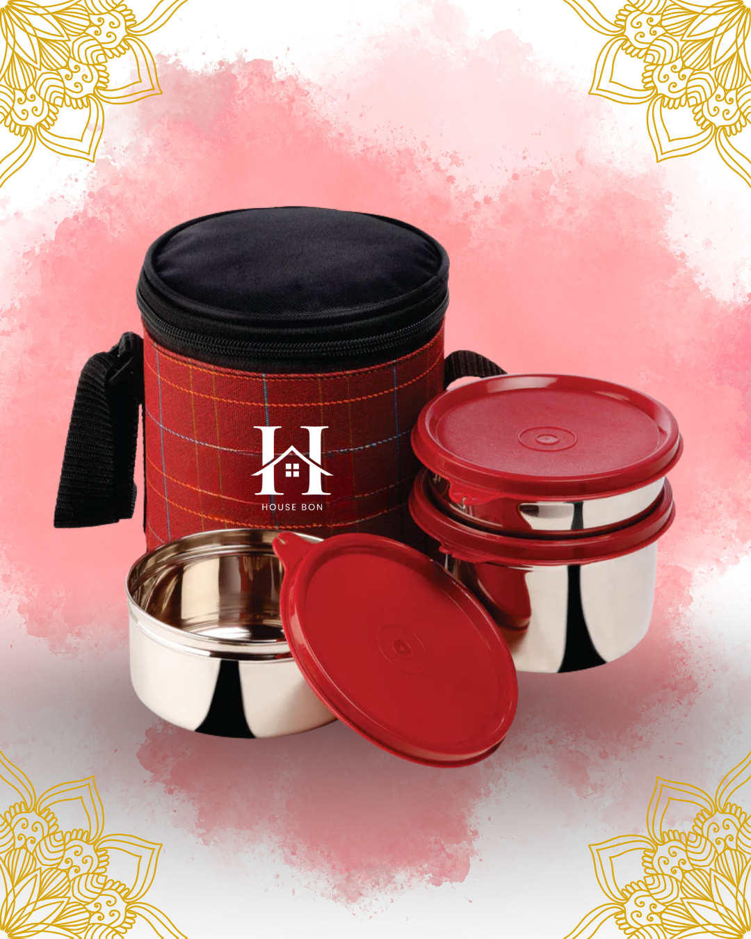Enjoy fresh, spill-free meals anywhere with the House Bon Stainless Steel Lunch Box Set. It includes 3 durable containers with airtight lids and a handy carry bag — ideal for office, school, or travel.