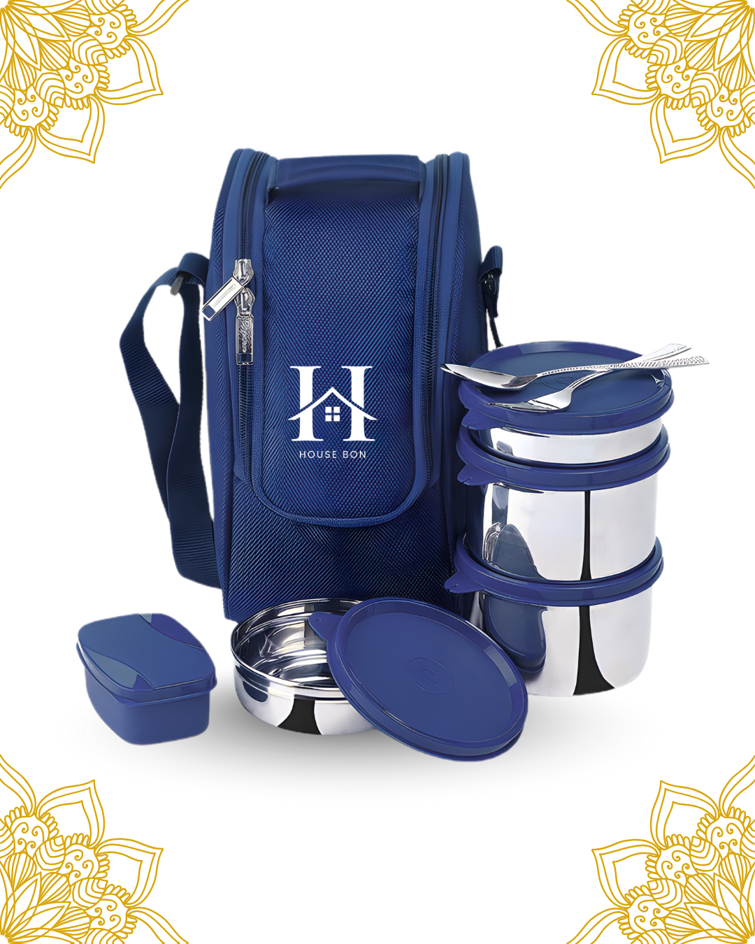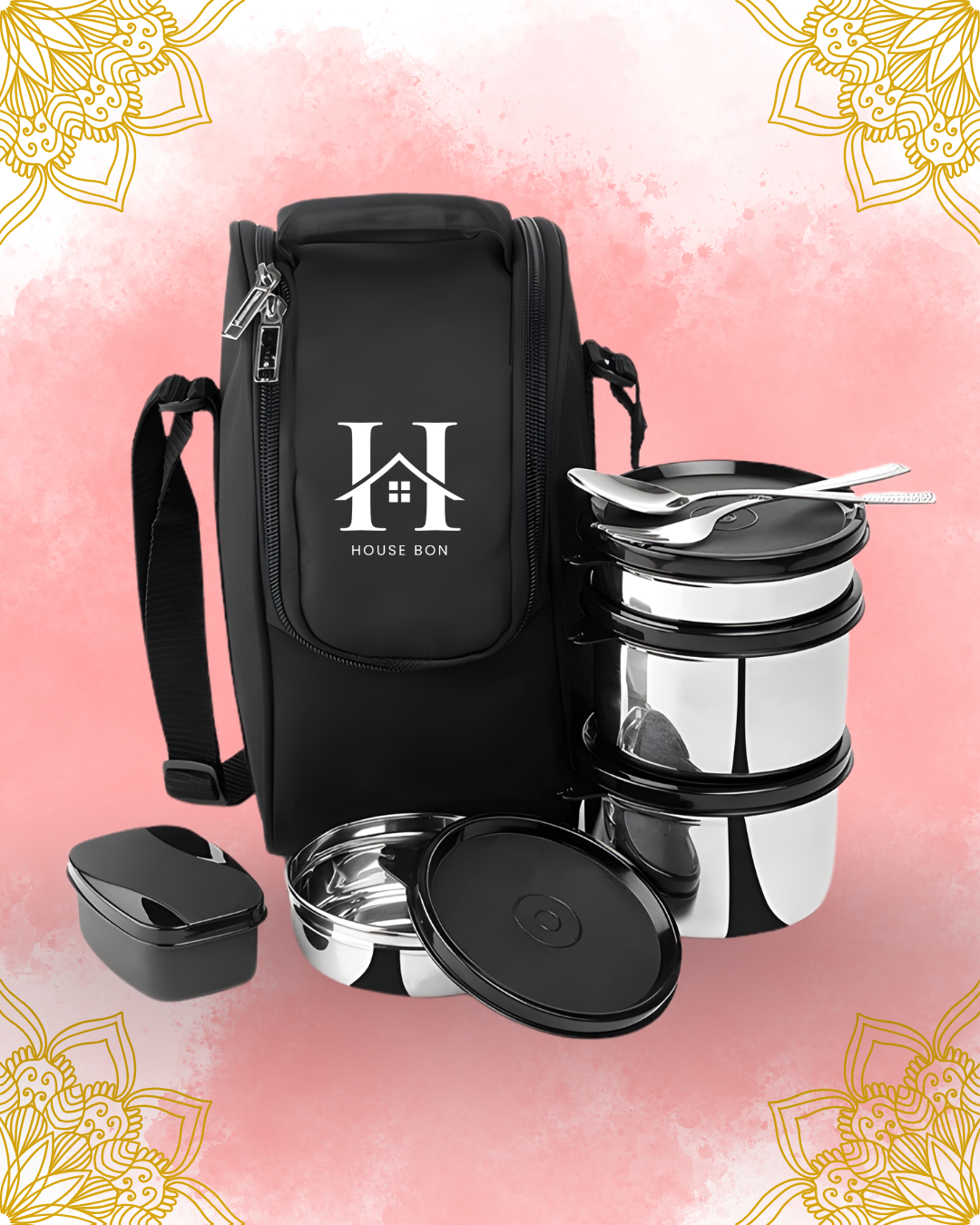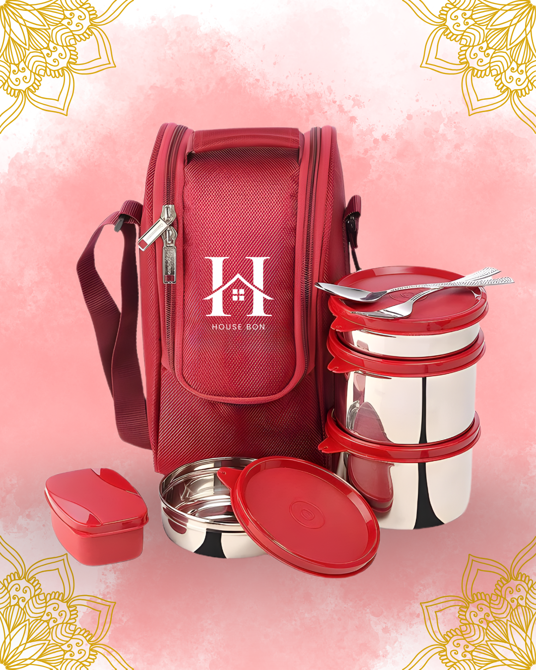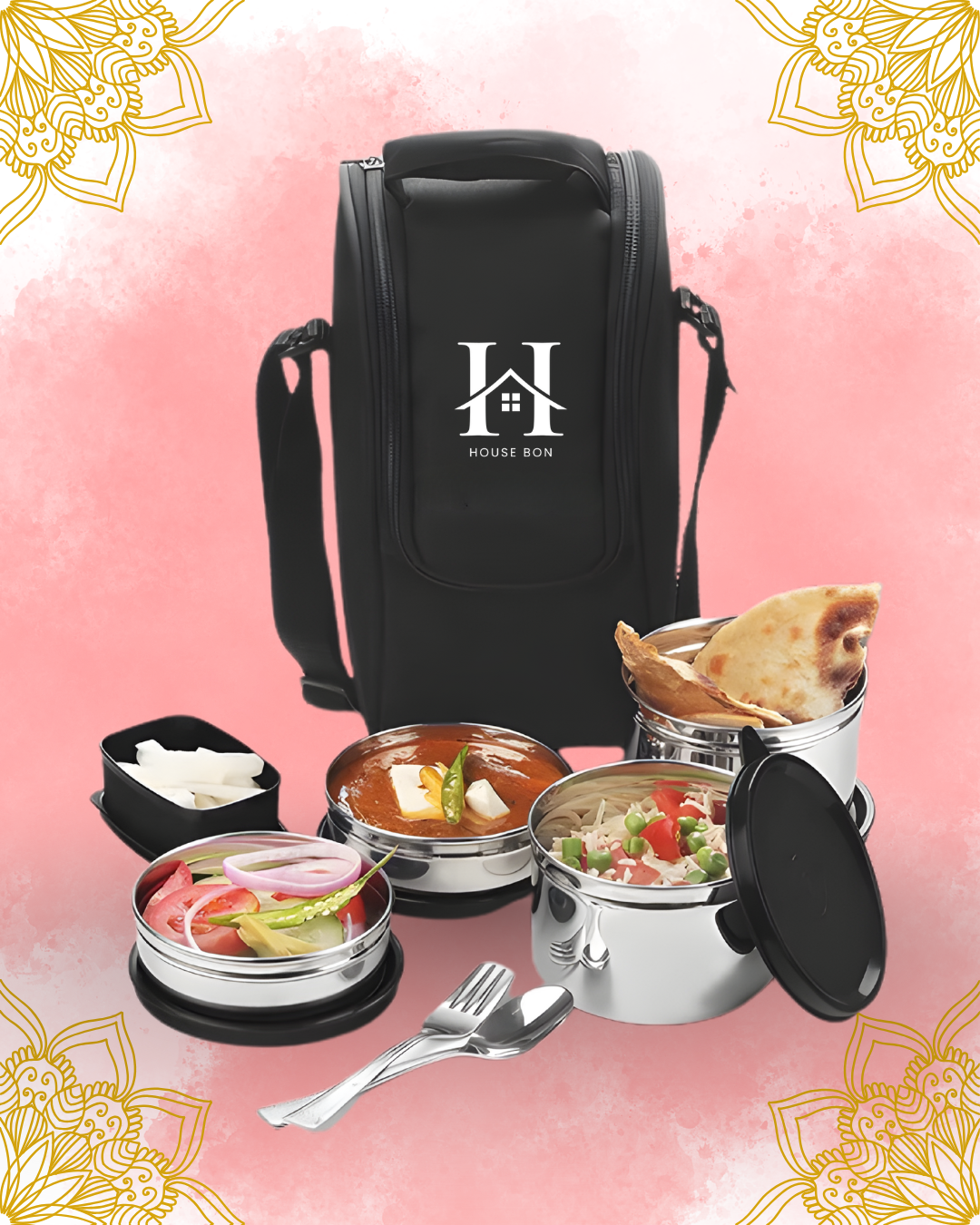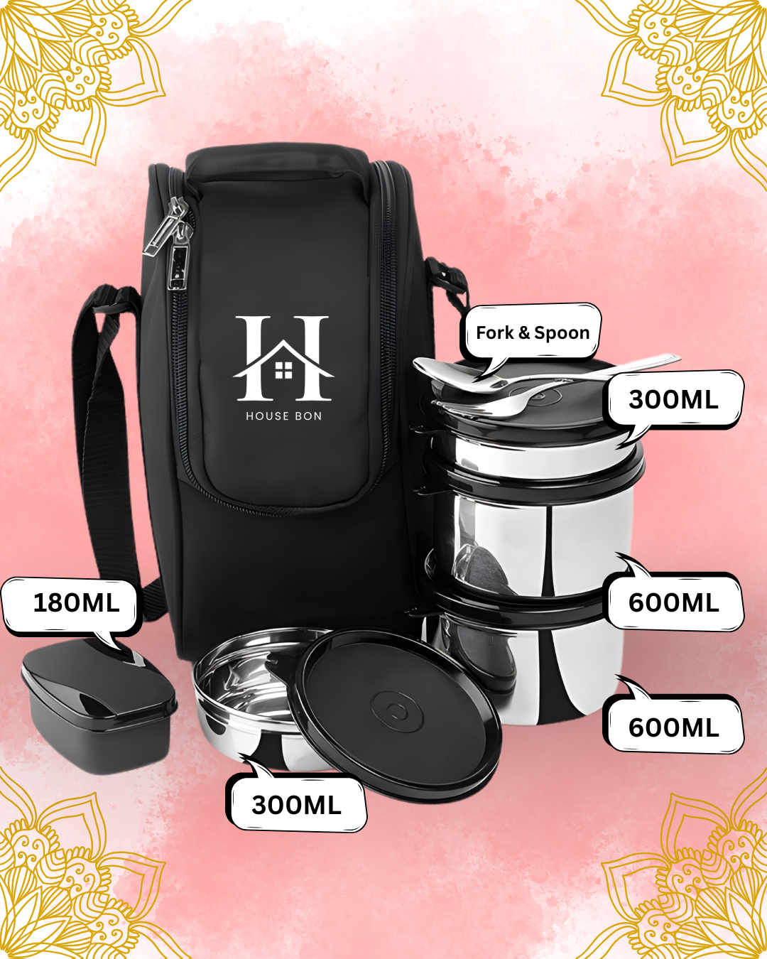 π± House Bon Stainless Steel Lunch Box Set β 4 Containers + Plastic Container + Spoon & Fork