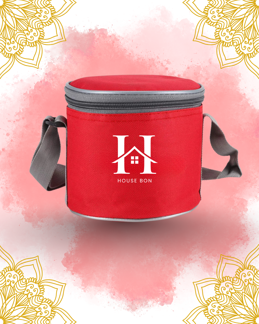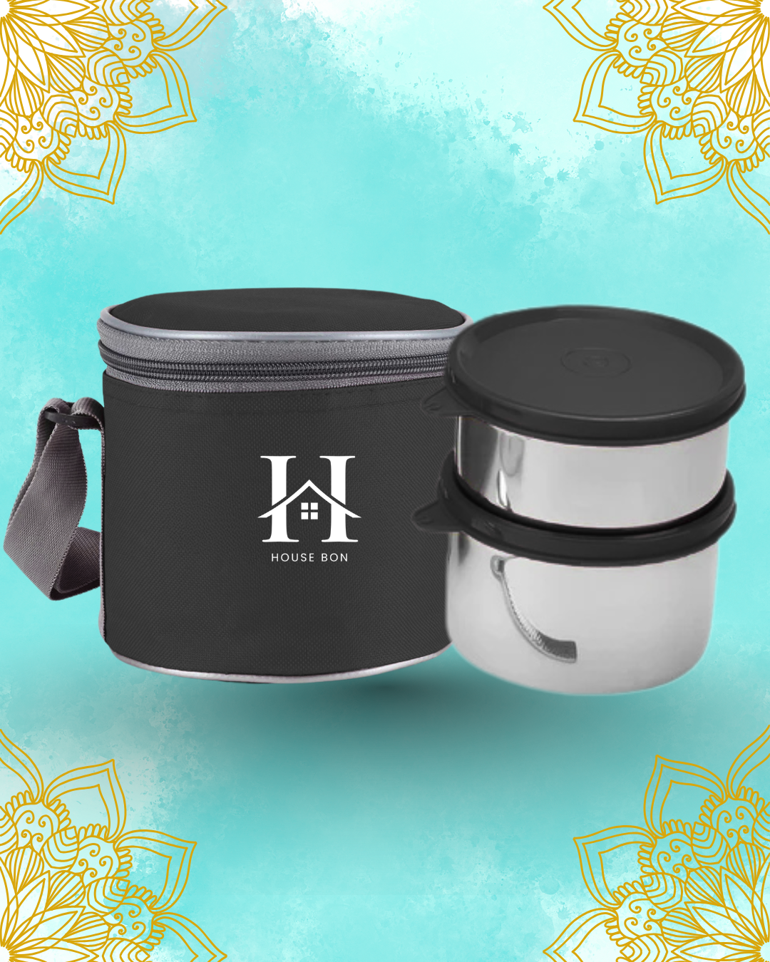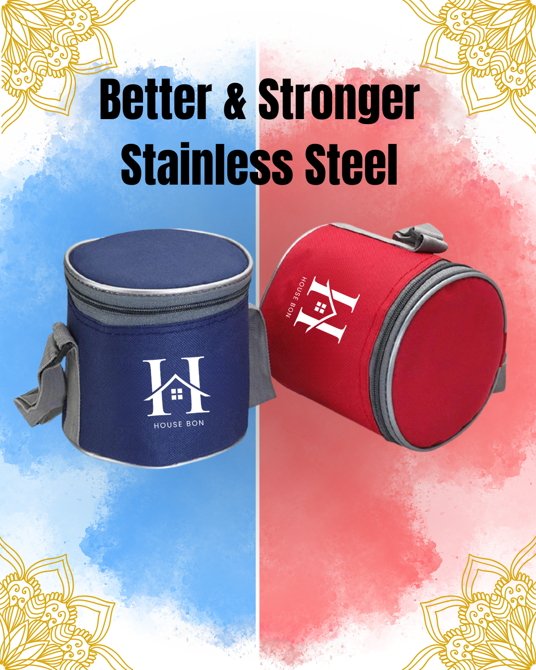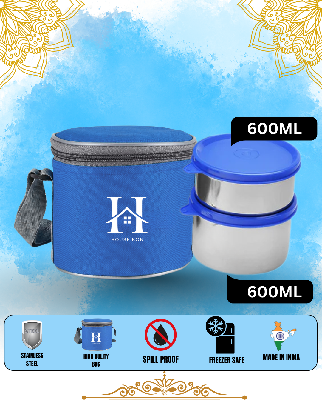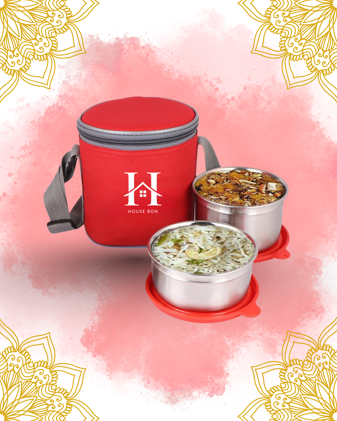 House Bon Stainless Steel Lunch Box (2×600ml) with Insulated Carry Bag – Available in Red, Blue & Black