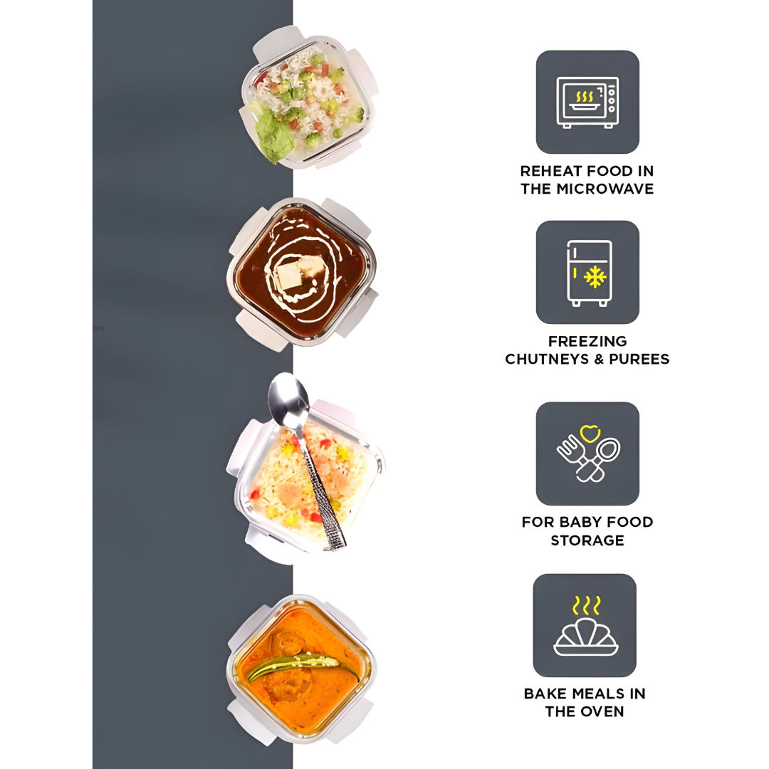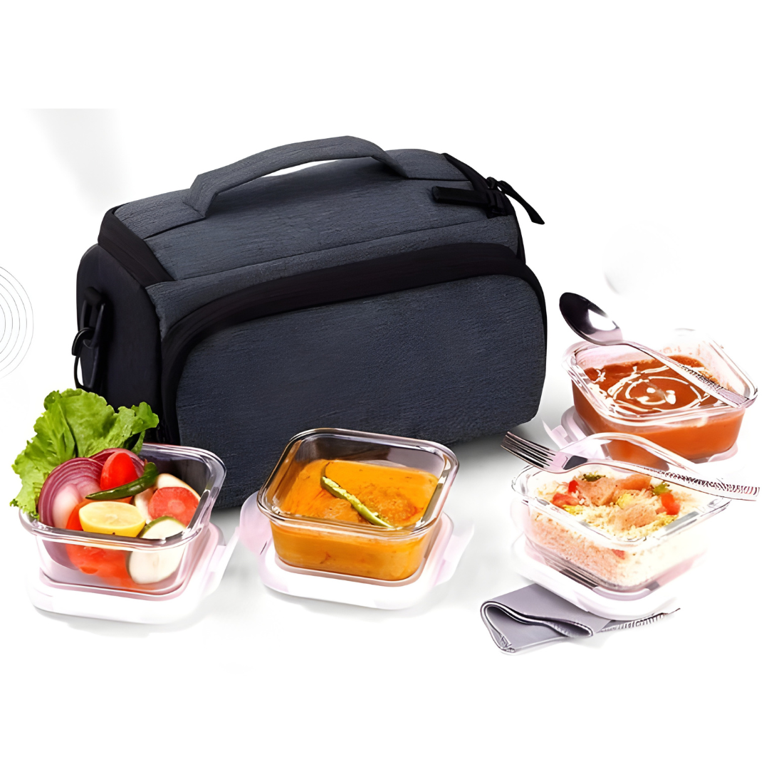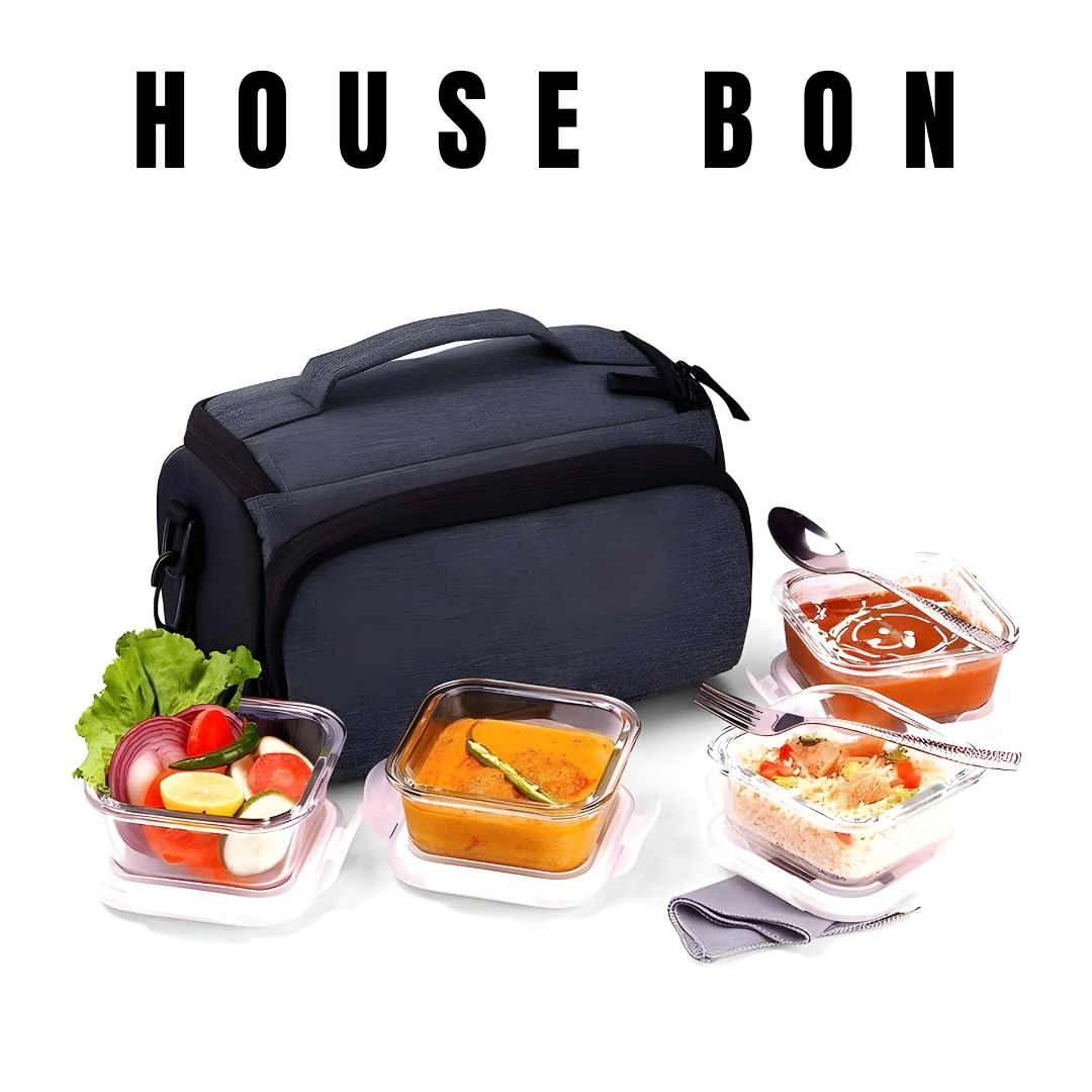 House Bon Elite Borosilicate Glass Lunch Box – 4 Containers (4×320ml) + Cutlery Set