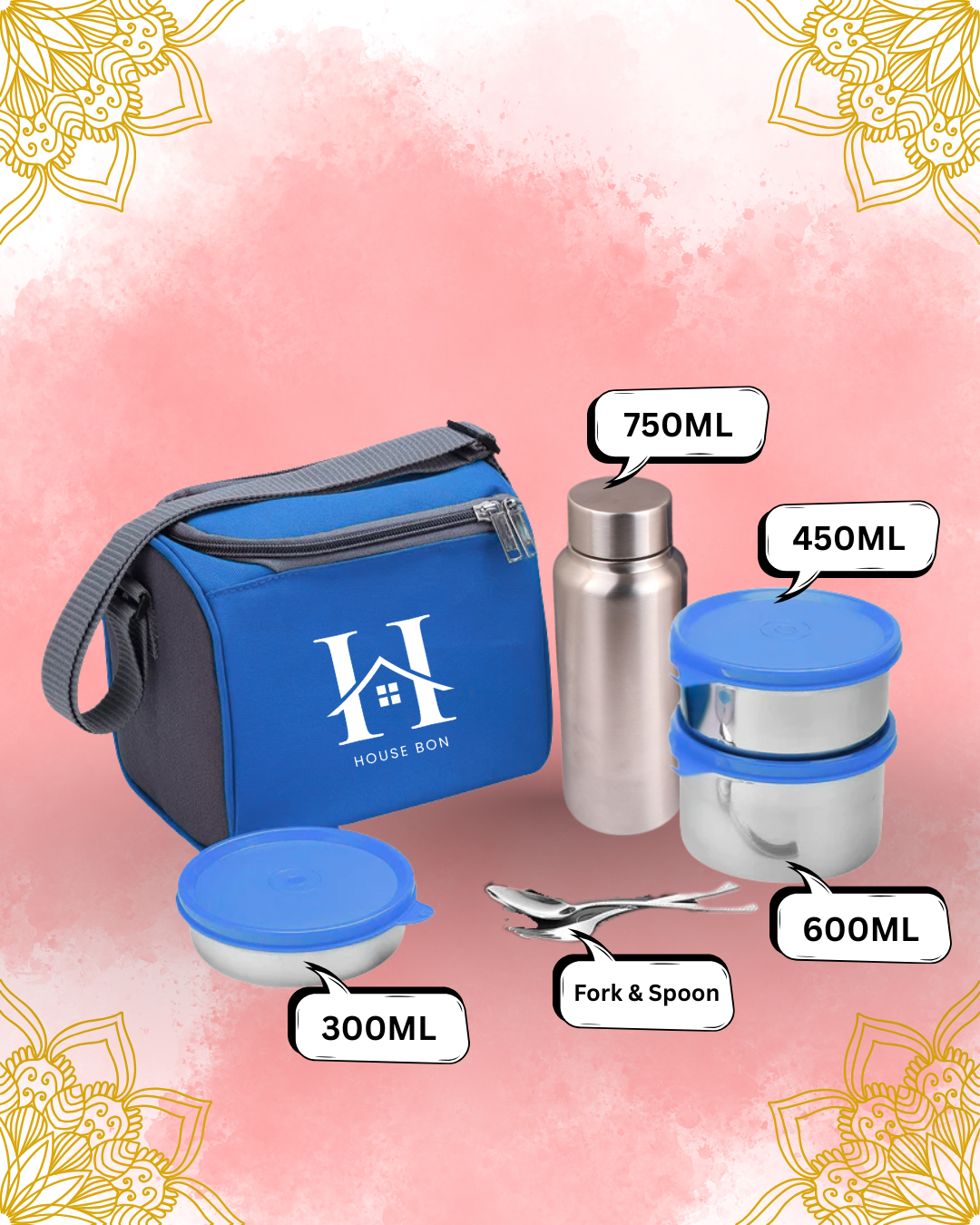 π± House Bon Stainless Steel Lunch Box Set β 3 Containers + 750 ml Bottle + Spoon & Fork