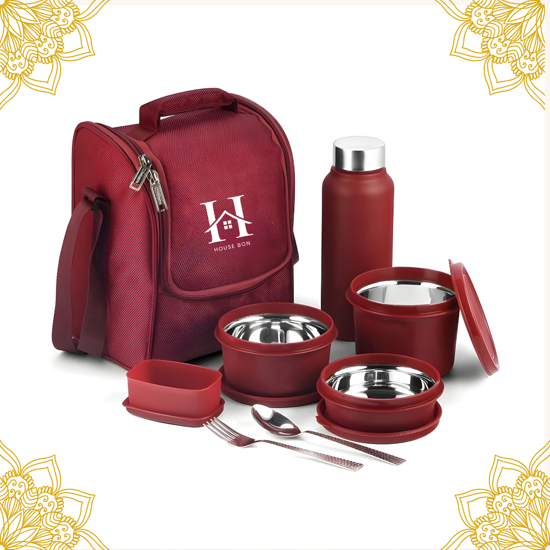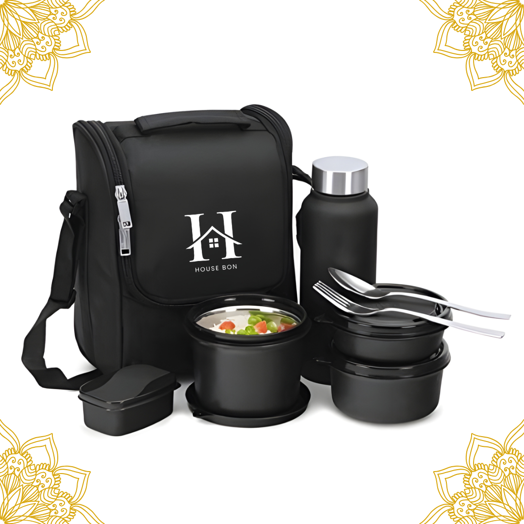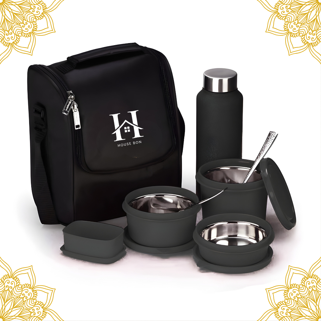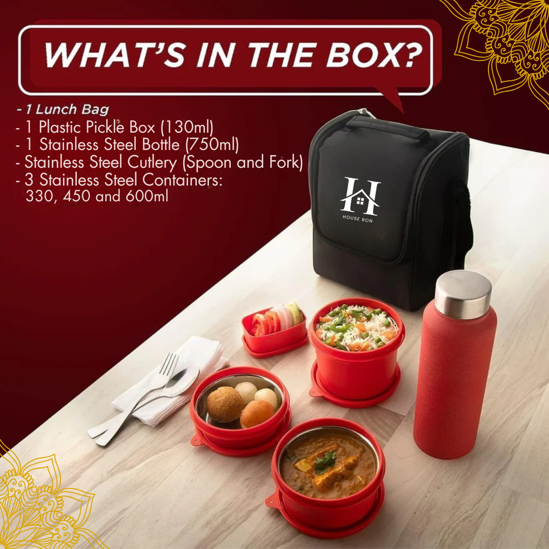 House Bon Teso Pro Lunch Box – 3 Containers (290ml + 450ml + 600ml) + 130ml Plastic Box + 750ml Steel Bottle + Cutlery