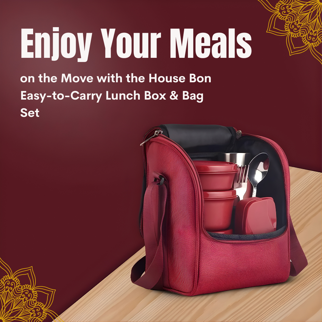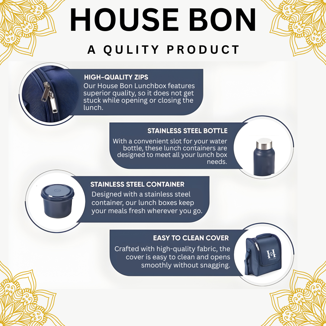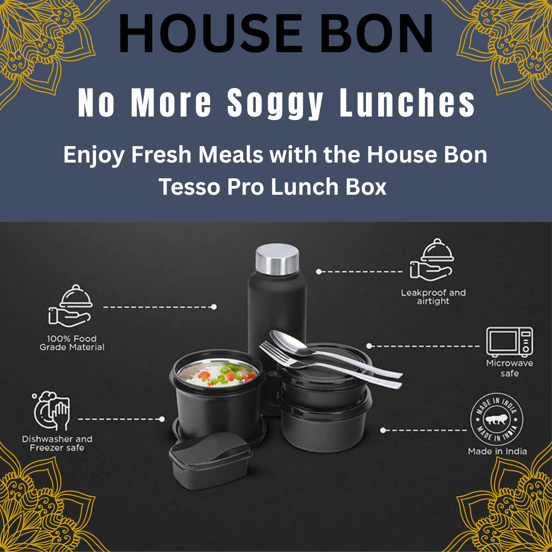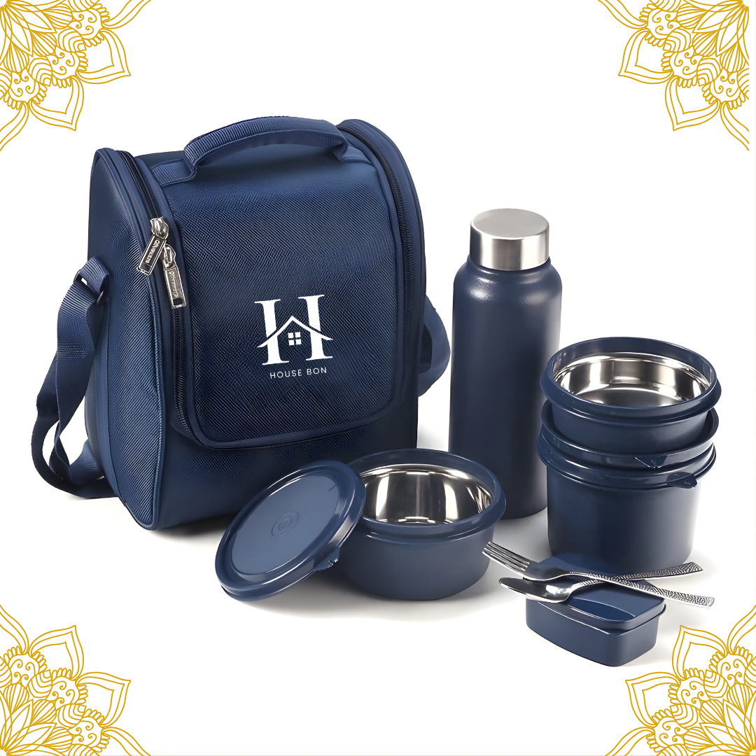 House Bon Teso Pro Lunch Box – 3 Containers (290ml + 450ml + 600ml) + 130ml Plastic Box + 750ml Steel Bottle + Cutlery