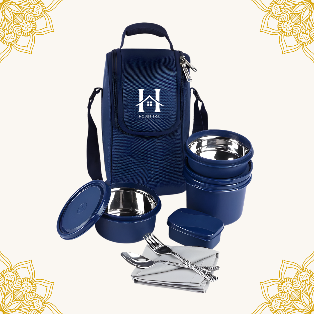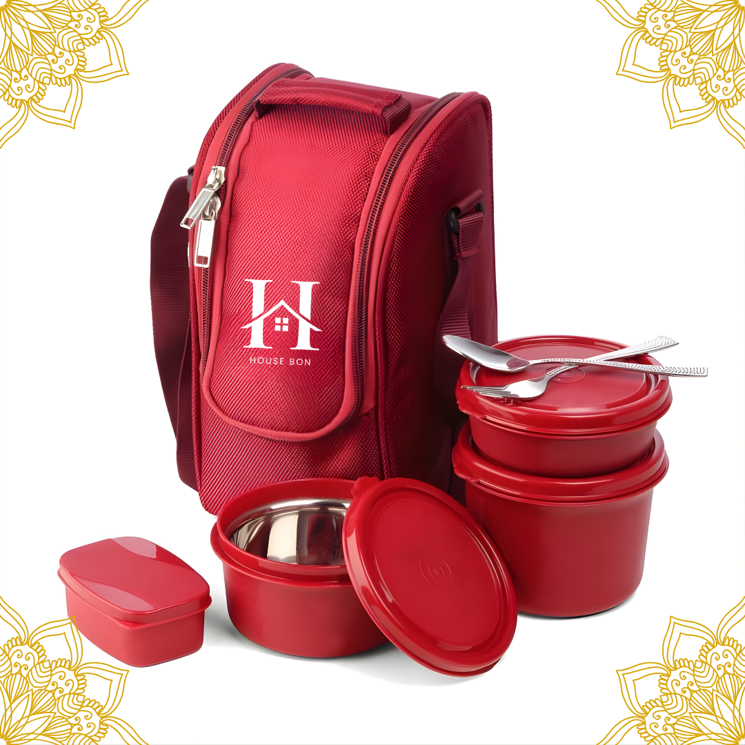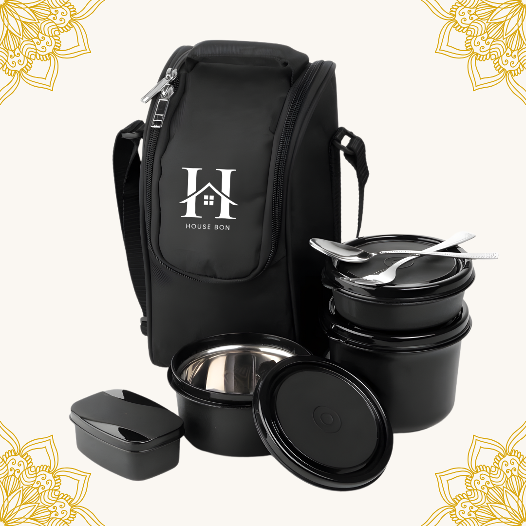 House Bon Executive Stainless Steel Lunch Box – 3 Containers (290ml + 450ml + 600ml) + 130ml Plastic Box + Cutlery