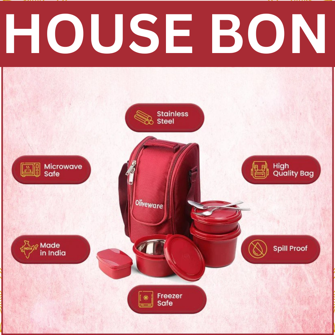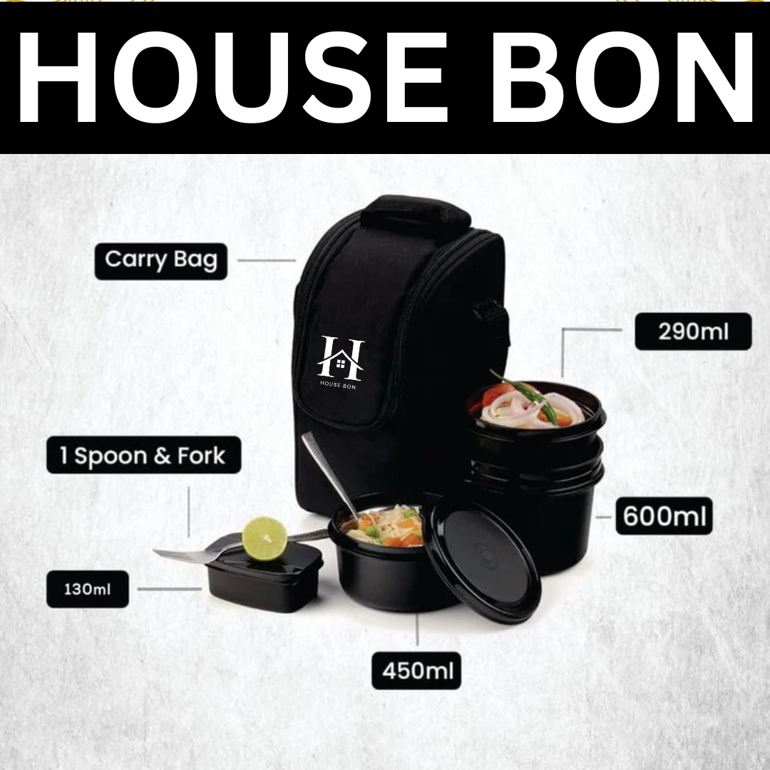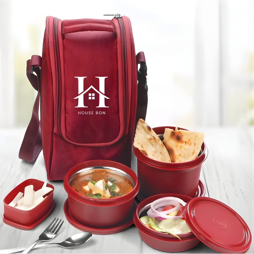 House Bon Executive Stainless Steel Lunch Box – 3 Containers (290ml + 450ml + 600ml) + 130ml Plastic Box + Cutlery