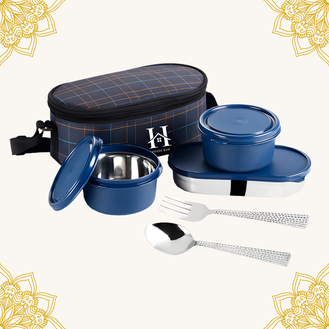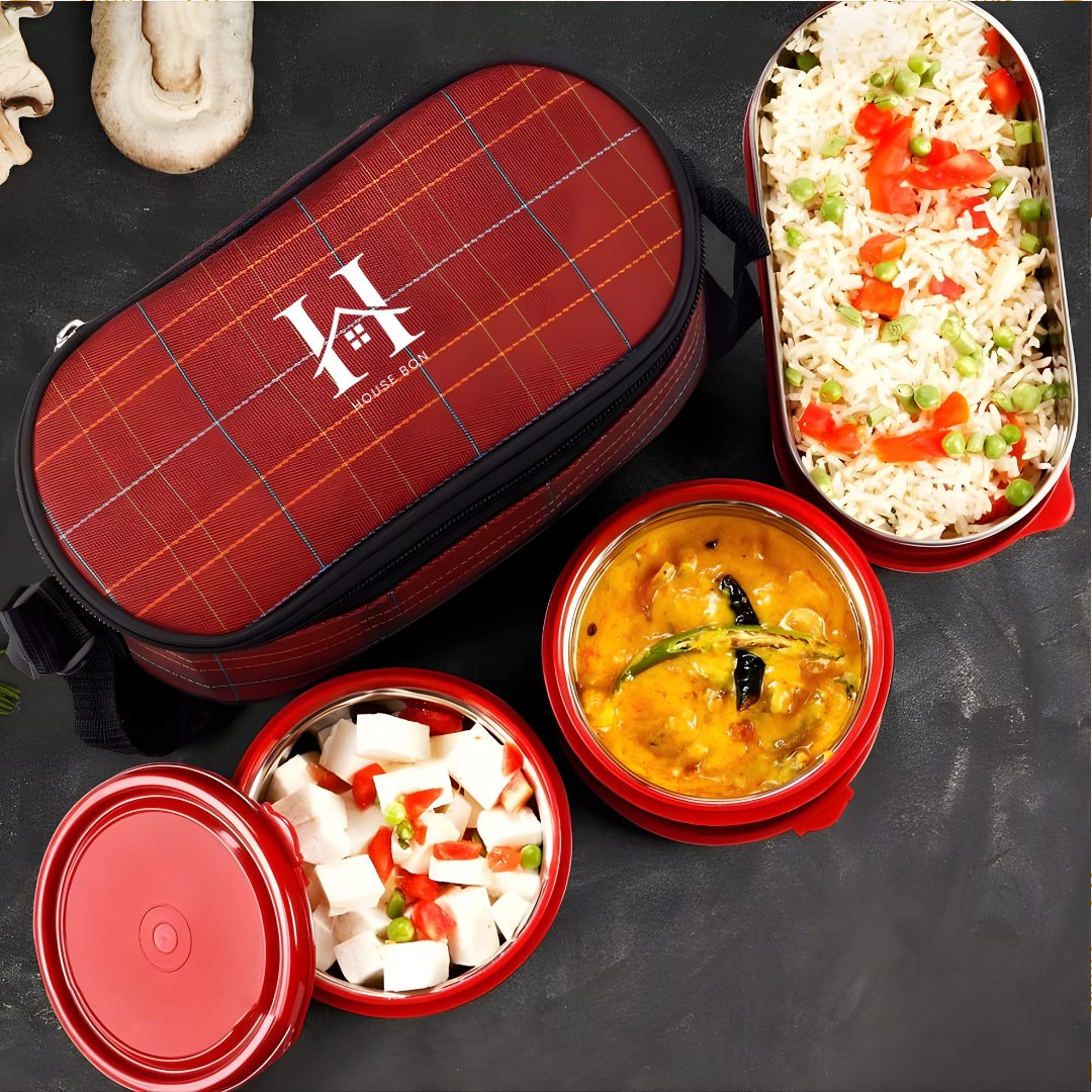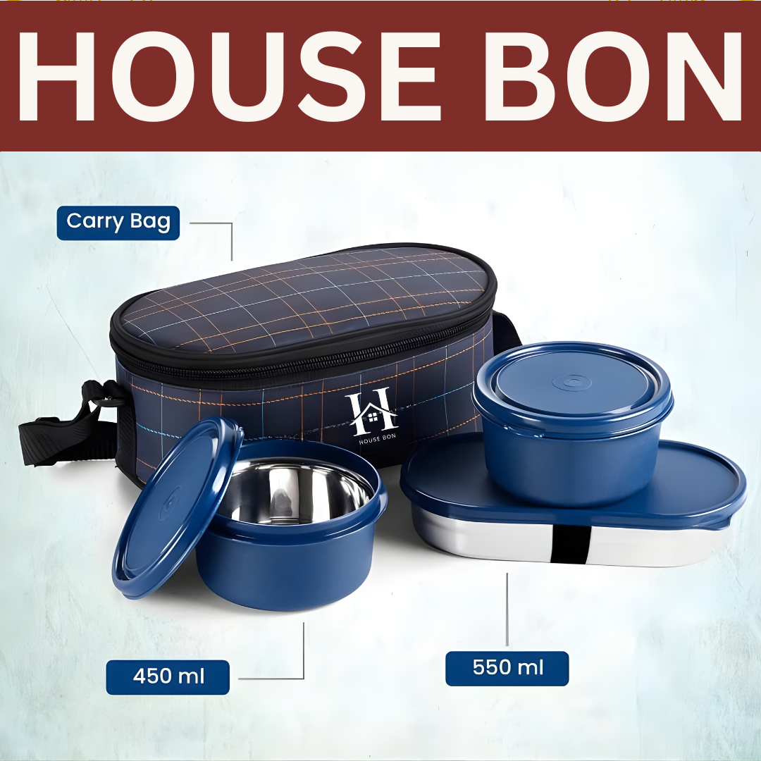 House Bon Stainless Steel Lunch Box – 3 Containers (2×450ml + 1×550ml) with Steel Cutlery