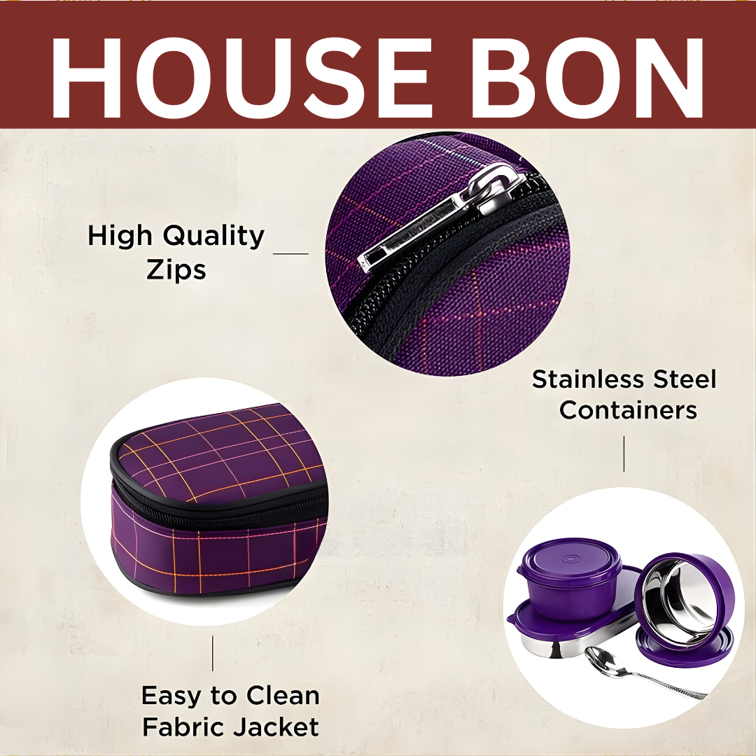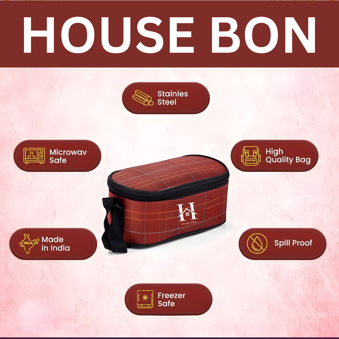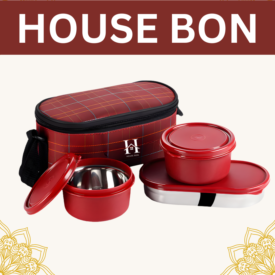 House Bon Stainless Steel Lunch Box – 3 Containers (2×450ml + 1×550ml) with Steel Cutlery